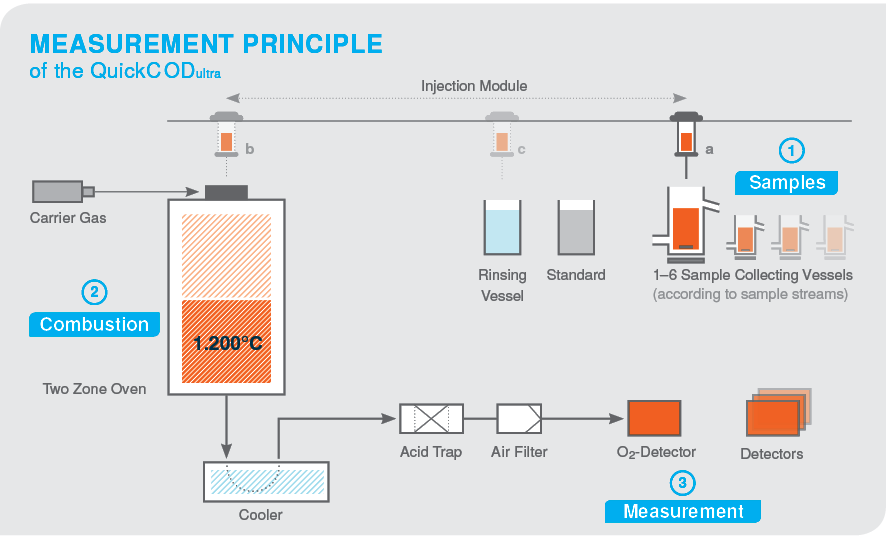 Exact Analysis. Clean, fast and accurate. In contrast to the common standard methods, which are time consuming and require dangerous reagents, the QuickCODultra uses the combustion method. It is fast, using the original idea considering the oxygen required for the oxidation of the organic components contained in the water. This method goes without any use of dangerous and etching substances so that a high operational safety is ensured. Another advantage of this method is that the measurement results are taken from the complete digestion and free from chloride interference.